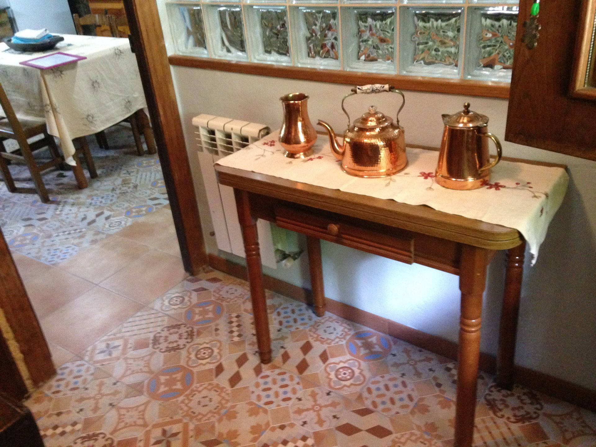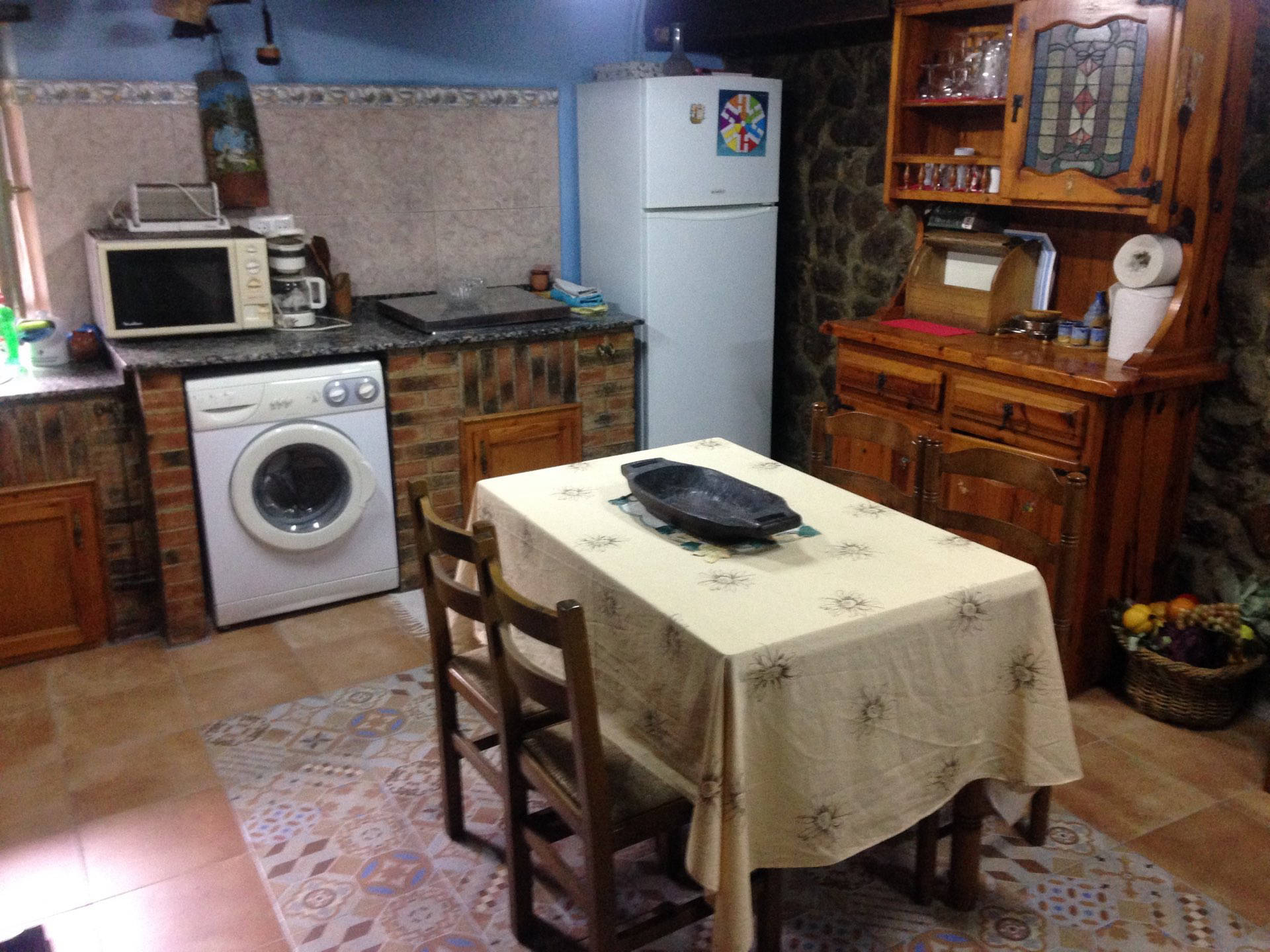 Está la cocina-comedor: cocina de leña-carbón tradicional de oriente de Asturias y cocina de gas, además de nevera-combi, microondas, cafetera, tostadora y lavadora. El comedor está compuesto por una mesa extensible y escaño tradicional con una pequeña tele para reposar y dormir la siesta.